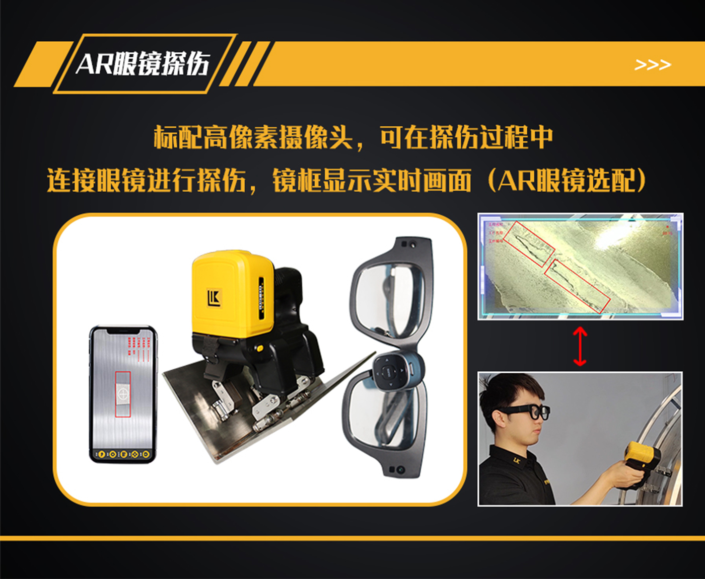 11、探頭內部裝有500萬像素攝像頭,手機、平板電腦或AR眼鏡等手持終端安裝APP軟件,通過Wi-Fi與探頭鏈接,手持終端實時顯示探傷狀態;