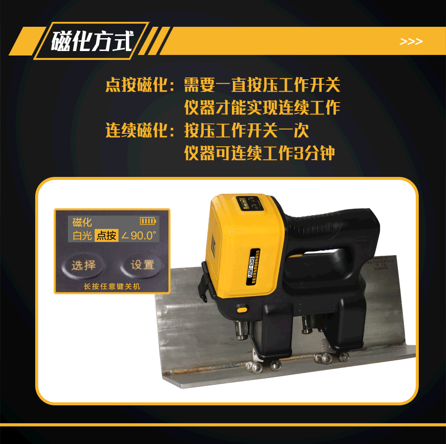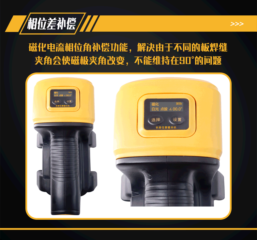 10、磁化電流相位角補償功能;檢測不同夾角度的角焊縫,可在鋰電池電源OLED顯示屏上設置需要探測的工件夾角,解決由于不同的板焊縫夾角會使磁極夾角改變,不能維持在90°的問題;
