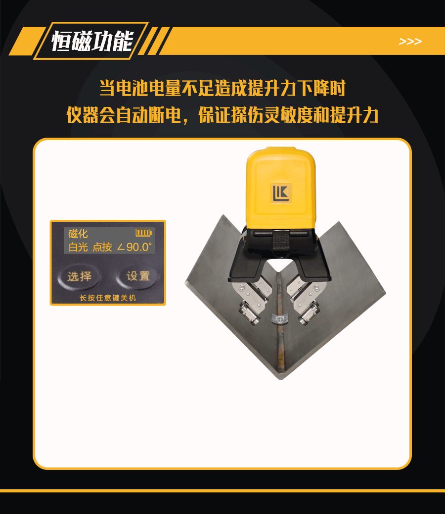 6、恒磁控制功能,因電量下降導致提升力不滿足探傷需求時自動斷電,保證探傷靈敏度;